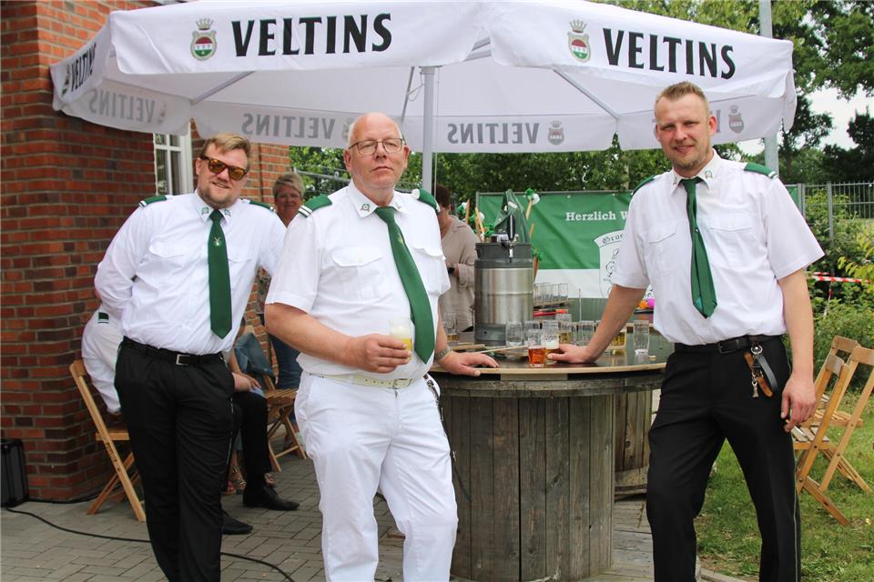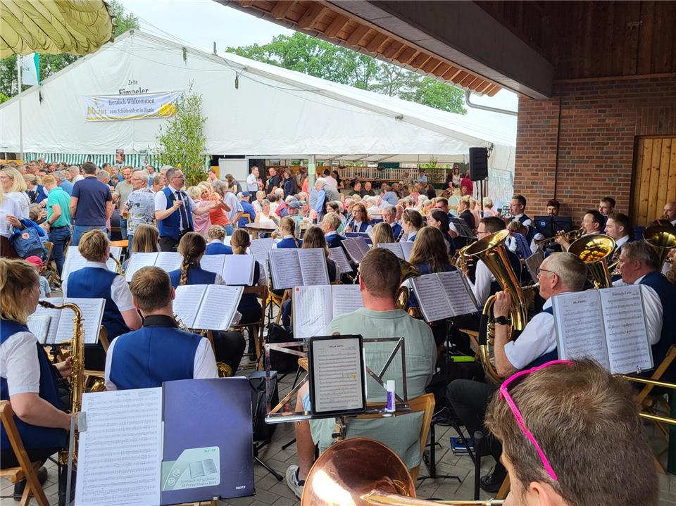Hier konnten sich Markus Fasselt den rechten und Klaas Hollander den linken Flügel sichern. Hollander war ein weiteres Mal erfolgreich und schoss den Apfel hinunter. Jörg Berninger konnte das Zepter für sich verbuchen und Bernd Hüning brachte die Krone zu Fall. Die Stimmung auf dem Festplatz war ausgelassen, was sicher auch an der Begleitung des Schießens durch die Musikkapelle Burlo lag.