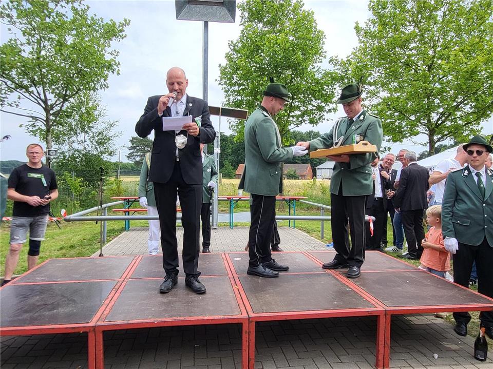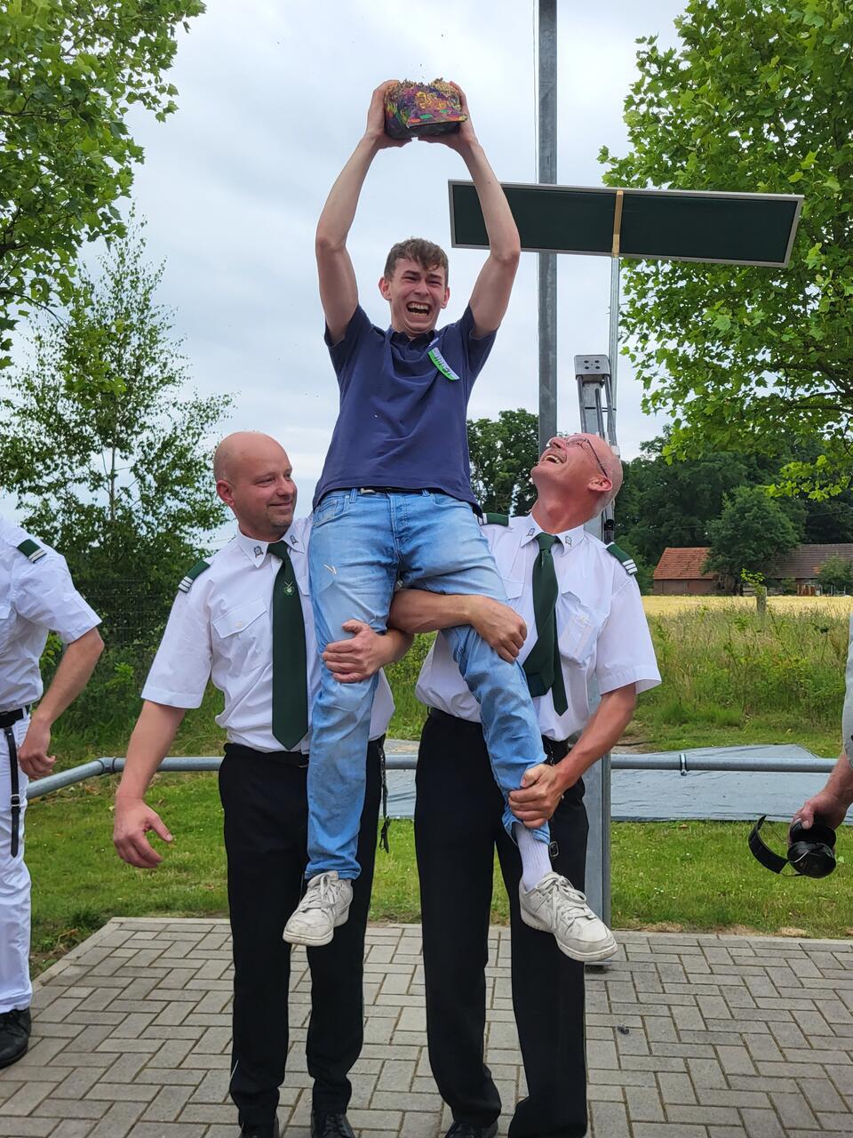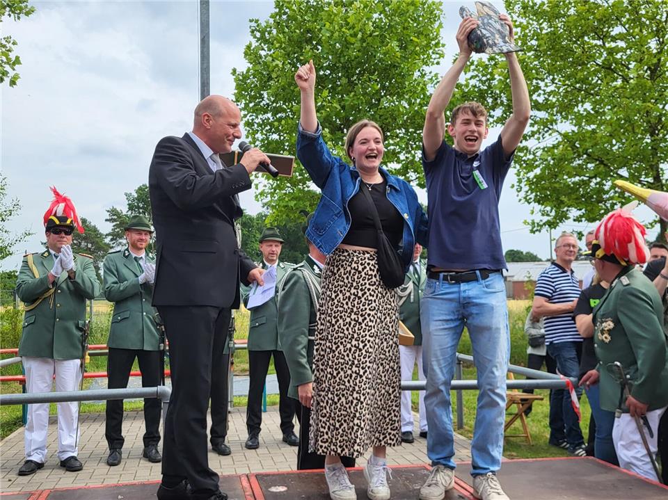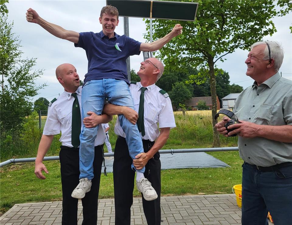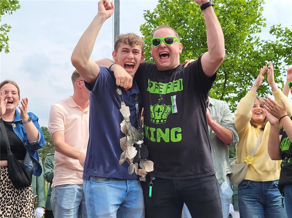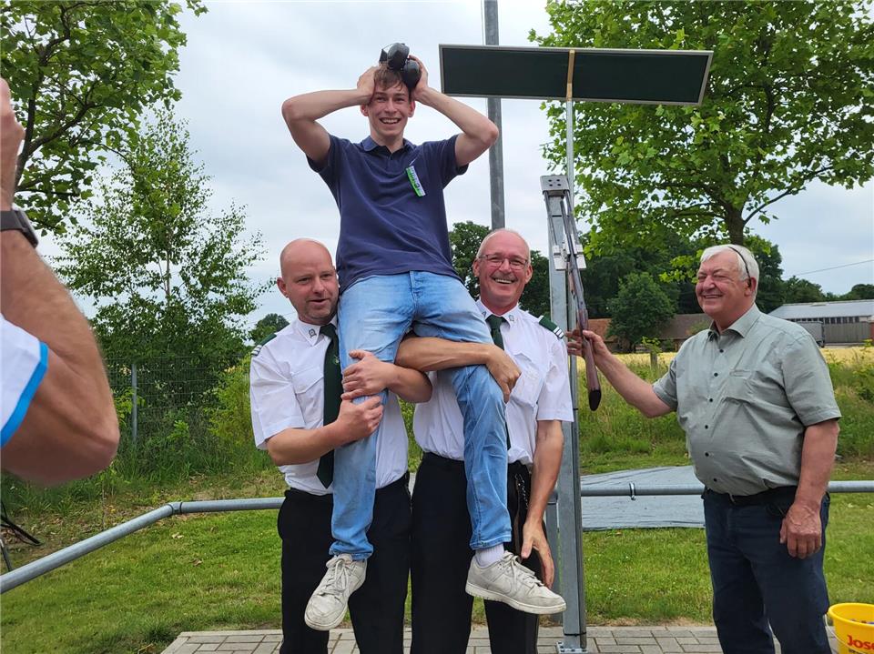 Einen Thron hatte er sich schon ausgeguckt und seine Freunde hätten ähnlich so viel „Bock“ wie er, sagte er im Vorfeld. Dass er mit diesen Worten Recht behalten sollte, wurde nur kurze Zeit später zur Gewissheit. Nach einem kurzen, aber spannenden Duell, bei dem jeder Treffer das Ende des Holzadlers bedeuten hätte können, traf Ben Robers, um 14.06 Uhr, mit dem 241. Schuss, ins Schwarze und holte den Vogel von der Stange.