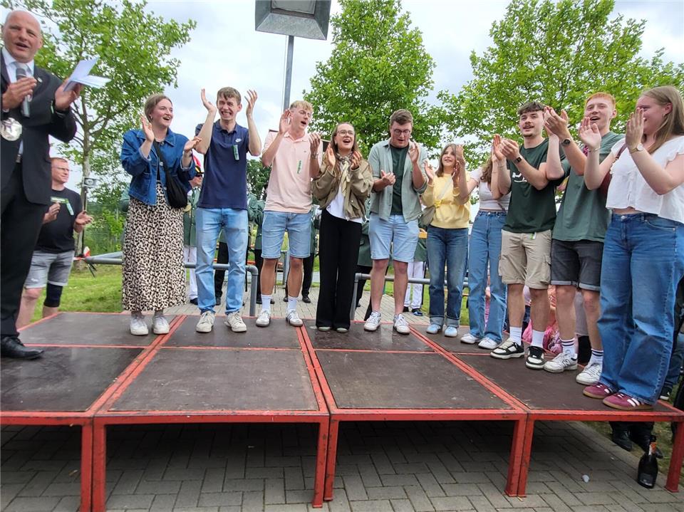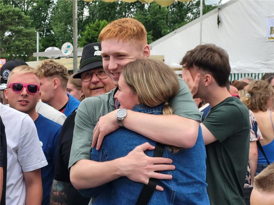 Überglücklich ließ sich der neue Schützenkönig von Burlo auf den Schultern seiner Kameraden tragen und von der Festgemeinde bejubeln. Nachdem viele Gratulanten ihre Glückwünsche an ihren neuen Regenten richten konnten, galt es für Robers, seine Königin und das Throngefolge zu benennen. Mit Marie Linfert kehrte er zurück zur Bühne und machte sie zur Königin. Sein Throngefolge besteht aus Jonah Niehaves mit Ines Janzen, Luca Kruse mit Mia Föcker, Phil-Bastian Kretschmer-Kamps mit Finja Heselhaus und Nils Anschlag mit Sophia Alferding.