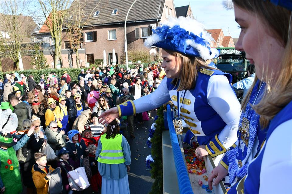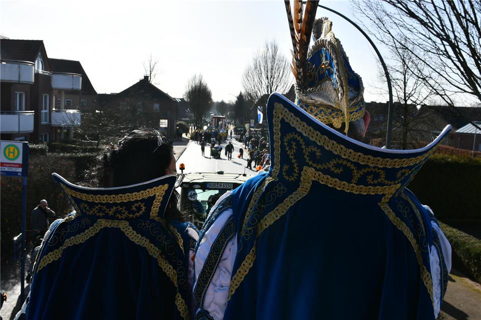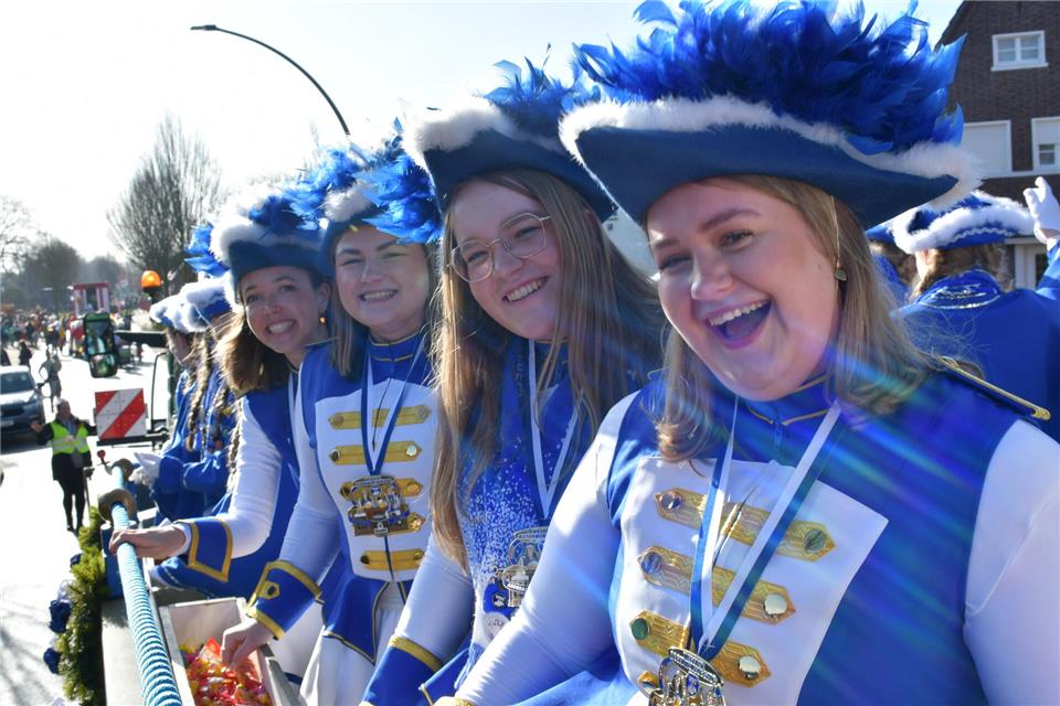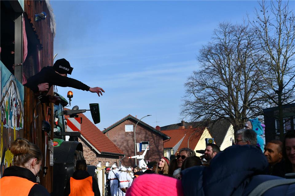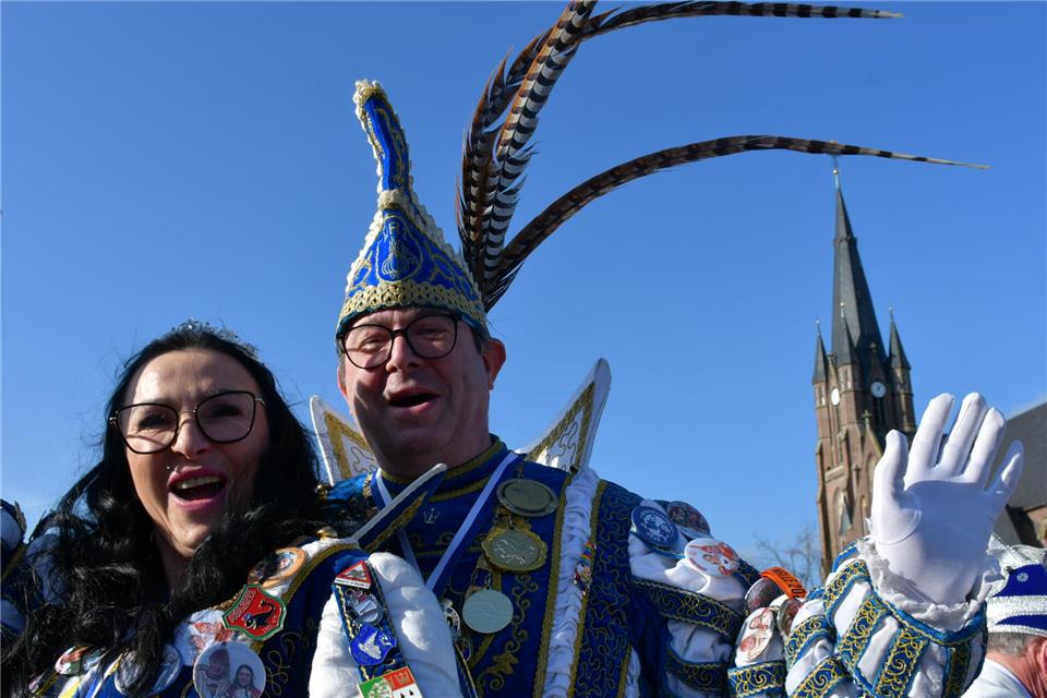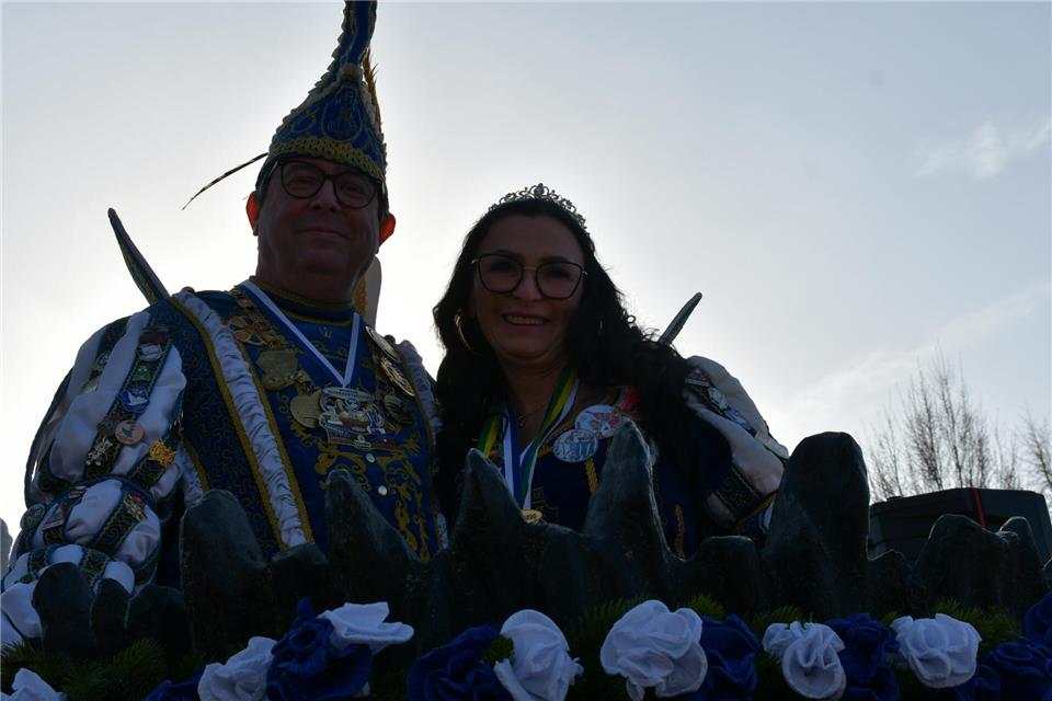 Andreas I. und Moni I. hatten vom hohen Prinzenwagen einen guten Blick auf die ganzen Narren am Wegesrand. „Es ist einfach wunderbar und dieses Wetter macht es perfekt“, sagte Moni I. und rief direkt wieder „Wäske Helau“ und warf die nächsten Kamelle in Richtung der Kinder, die strahlend und lachend die vielen hohen Wagen und bunten Gruppen bestaunten.