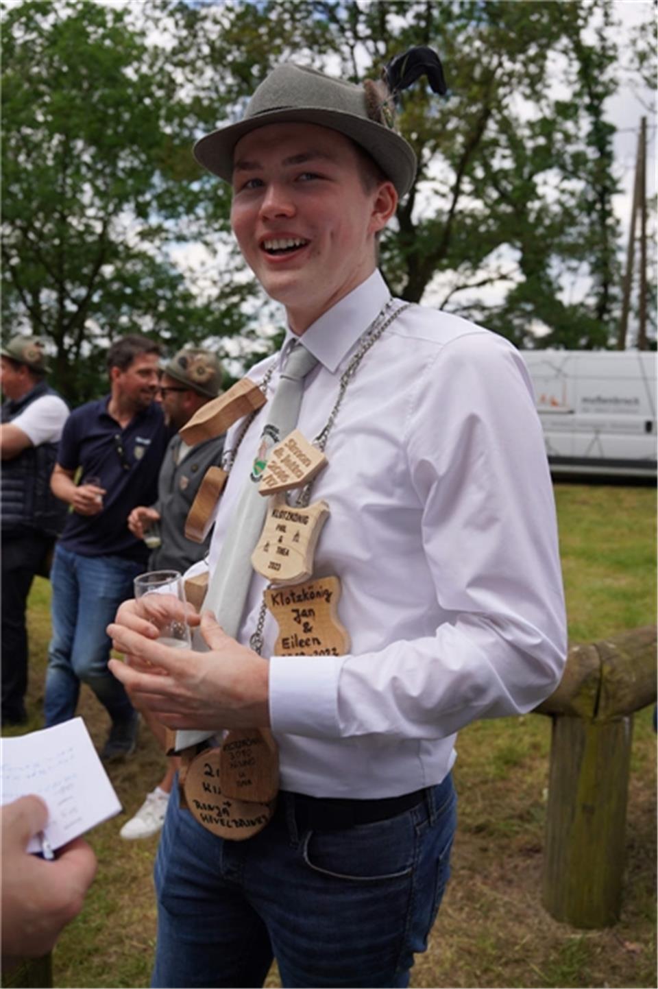 Außerdem Grund zum Feiern hatten auch die Schützen, die in diesem Jahr die Insignien von der Stange holten. Julius Lechtenberg schoss den linken und Hubertus Strotmann den rechten Flügel. Dagmar Jeske holte sich das Zepter, Bernhard Liemann den Apfel und Jörg Sanders sicherte sich die Krone. Nach dem Hochleben des neuen Königspaars und den obligatorischen Fotos war die Zeit des Klotzschießens gekommen. So konnte sich auch der Nachwuchs an der Vogelstange versuchen. Dabei triumphierte Jan Hendrik Einck. Seine Klotzkönigin wurde Emma van Üüm. Kinderschützenkönigin wurde am Vortag Clara Hülskamp. Sie erwählte Bernd Hagmann als ihren Mitregenten.