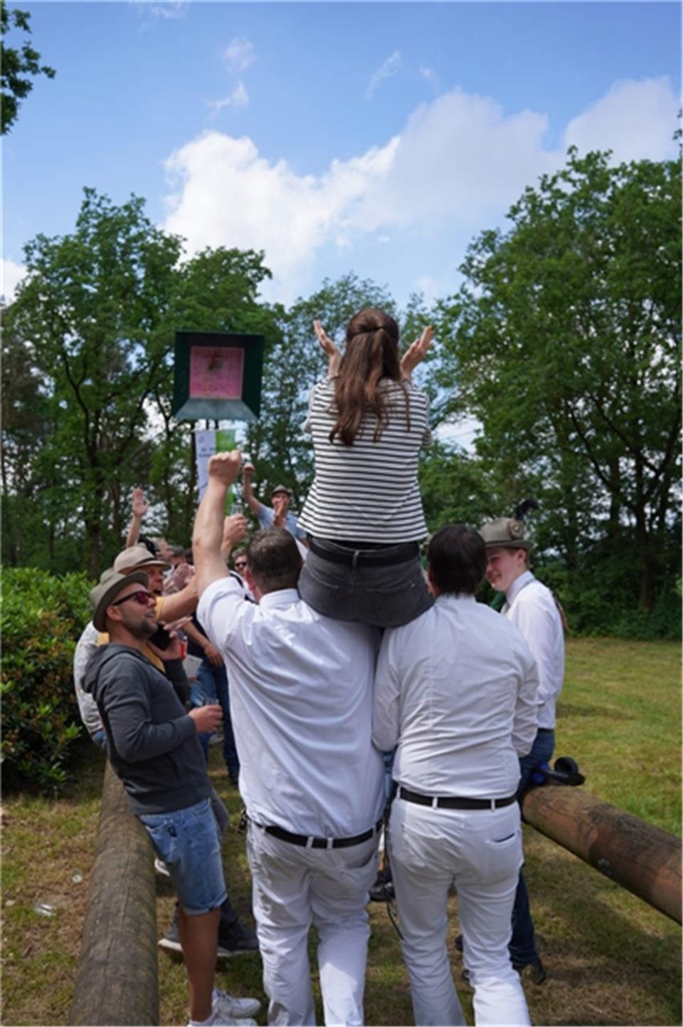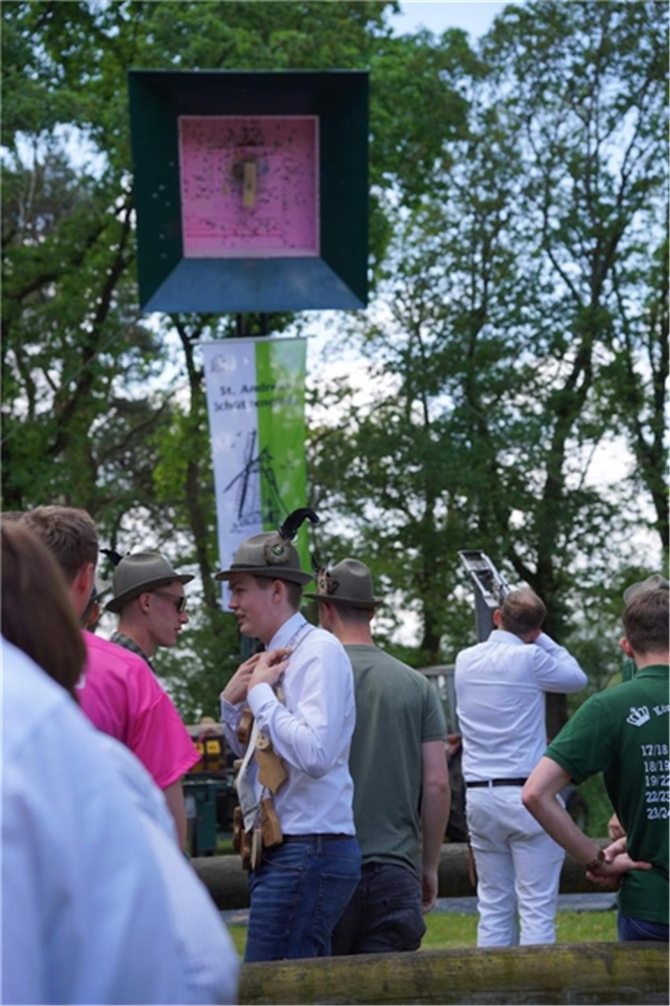 Beim Vogelschießen an der Vogelstange im Velener Venn wurde es am Pfingstmontag zum Ende hin noch mal richtig spannend. Julius Lechtenberg und Stefan Rosing lieferten sich ein Schießduell, bei dem der Vogel ordentlich Späne ließ und nach 303 Schuss zu Boden ging. In der Familie war es nicht die erste Regentschaft.